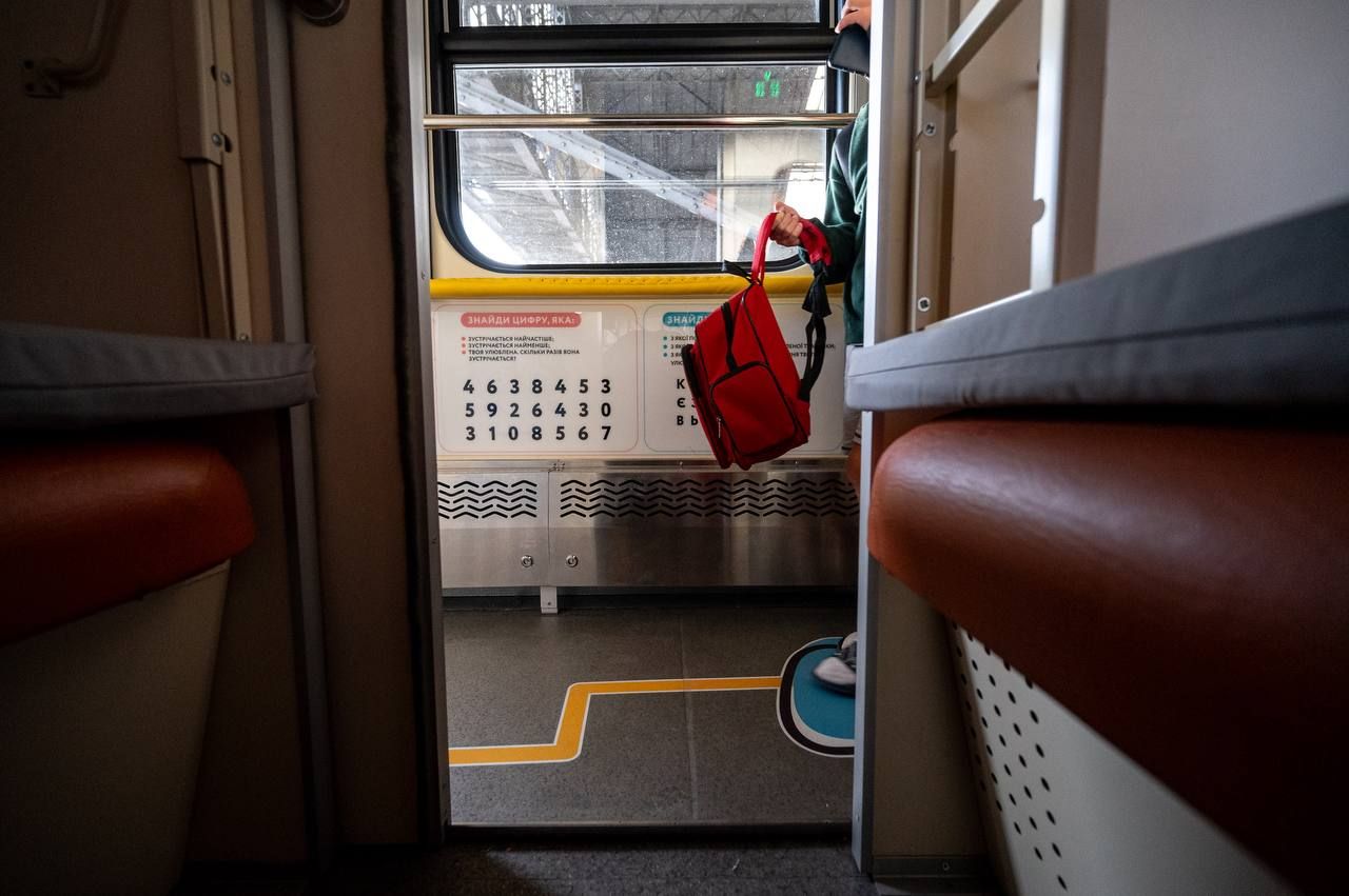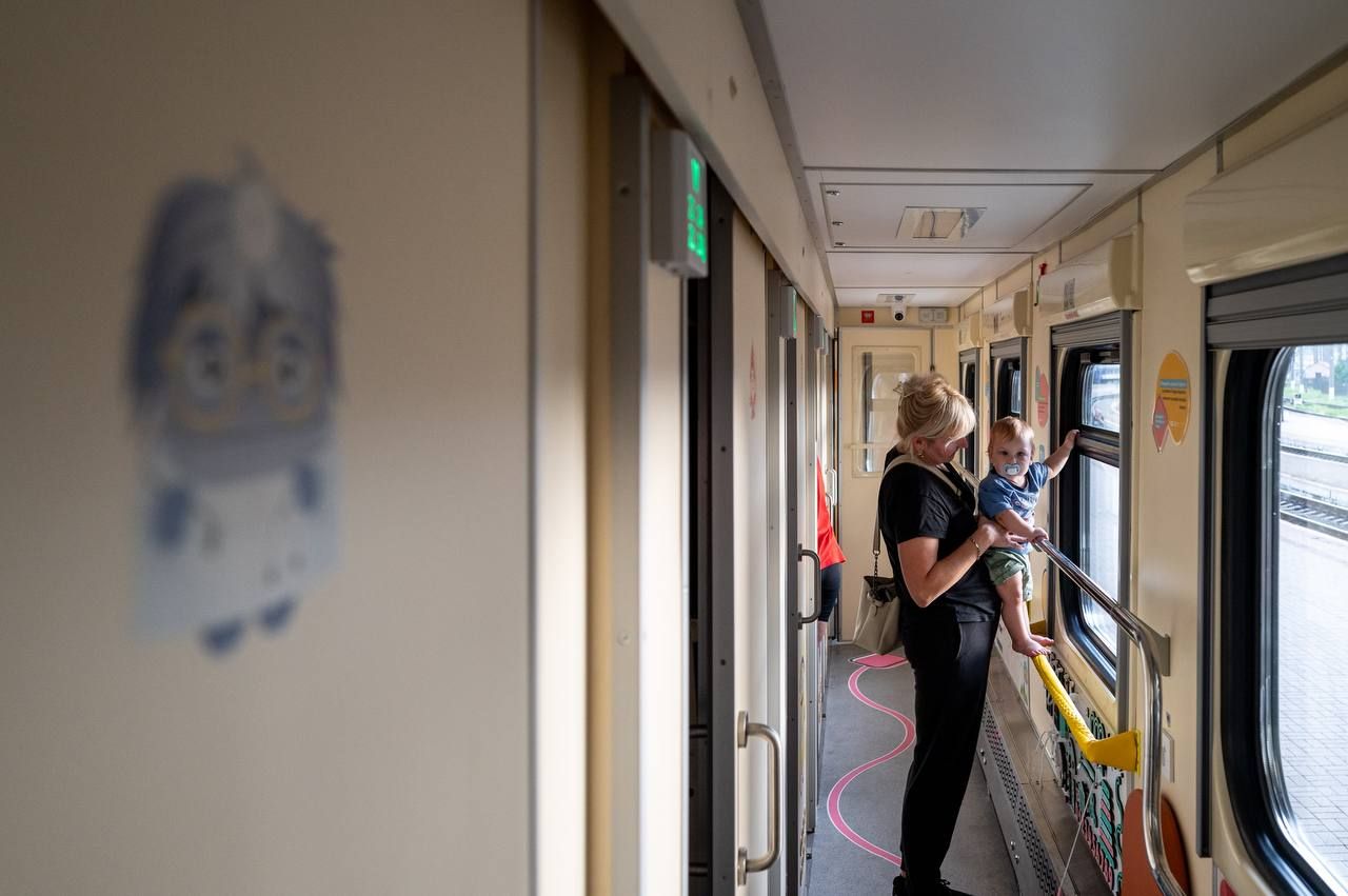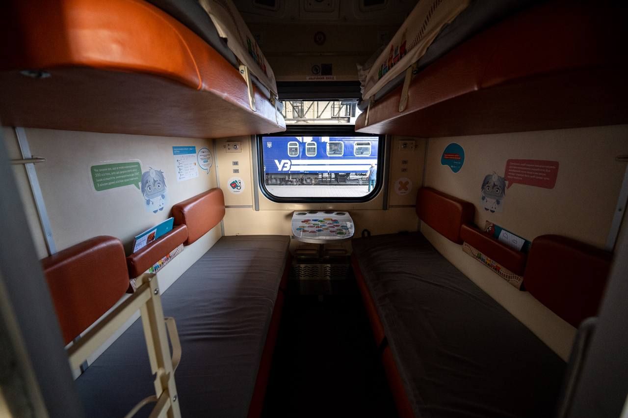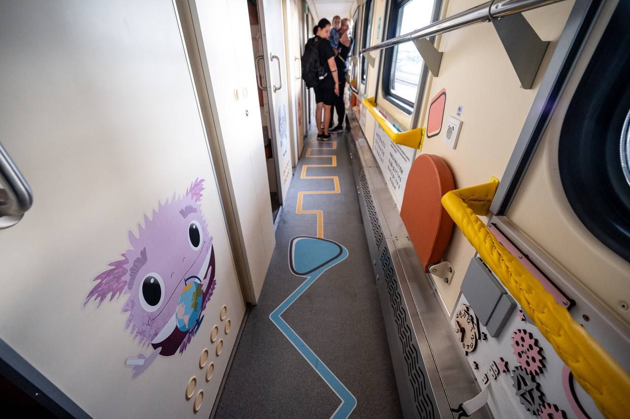 Кожне купе облаштували навчально-розважальними матеріалами, настільними іграми, манежами для малечі та збільшеними обмежувачами верхньої полички із протиударною накладкою. А в коридорах розмістили інтерактивні плакати, бізі-борди з рухомими елементами та дитячі поручні з мʼякою оббивкою для безпечного пересування,