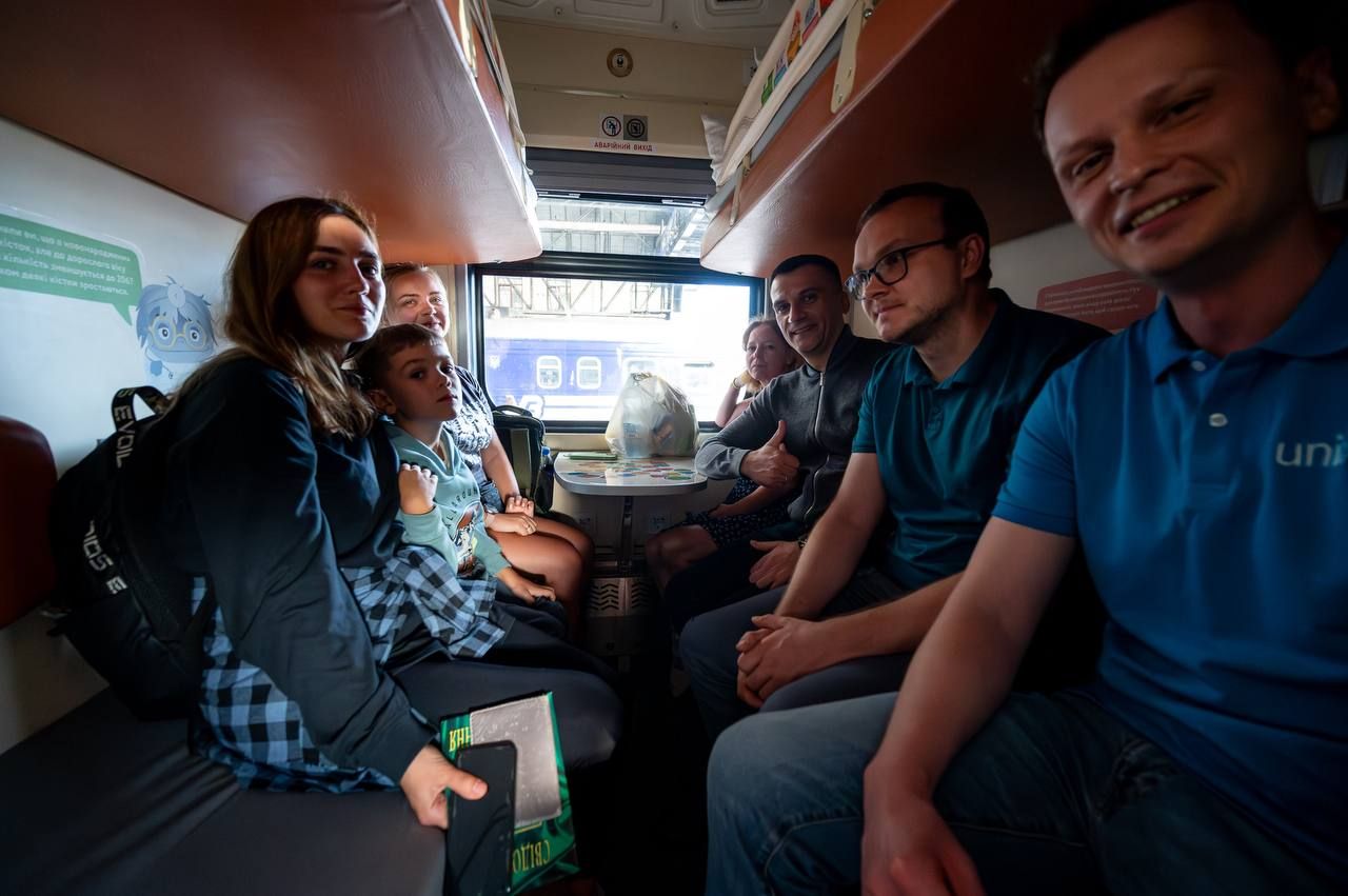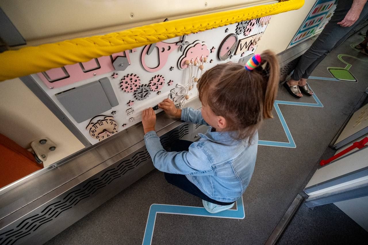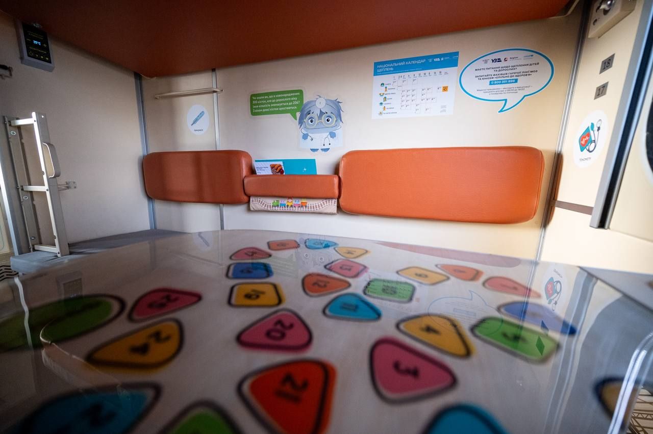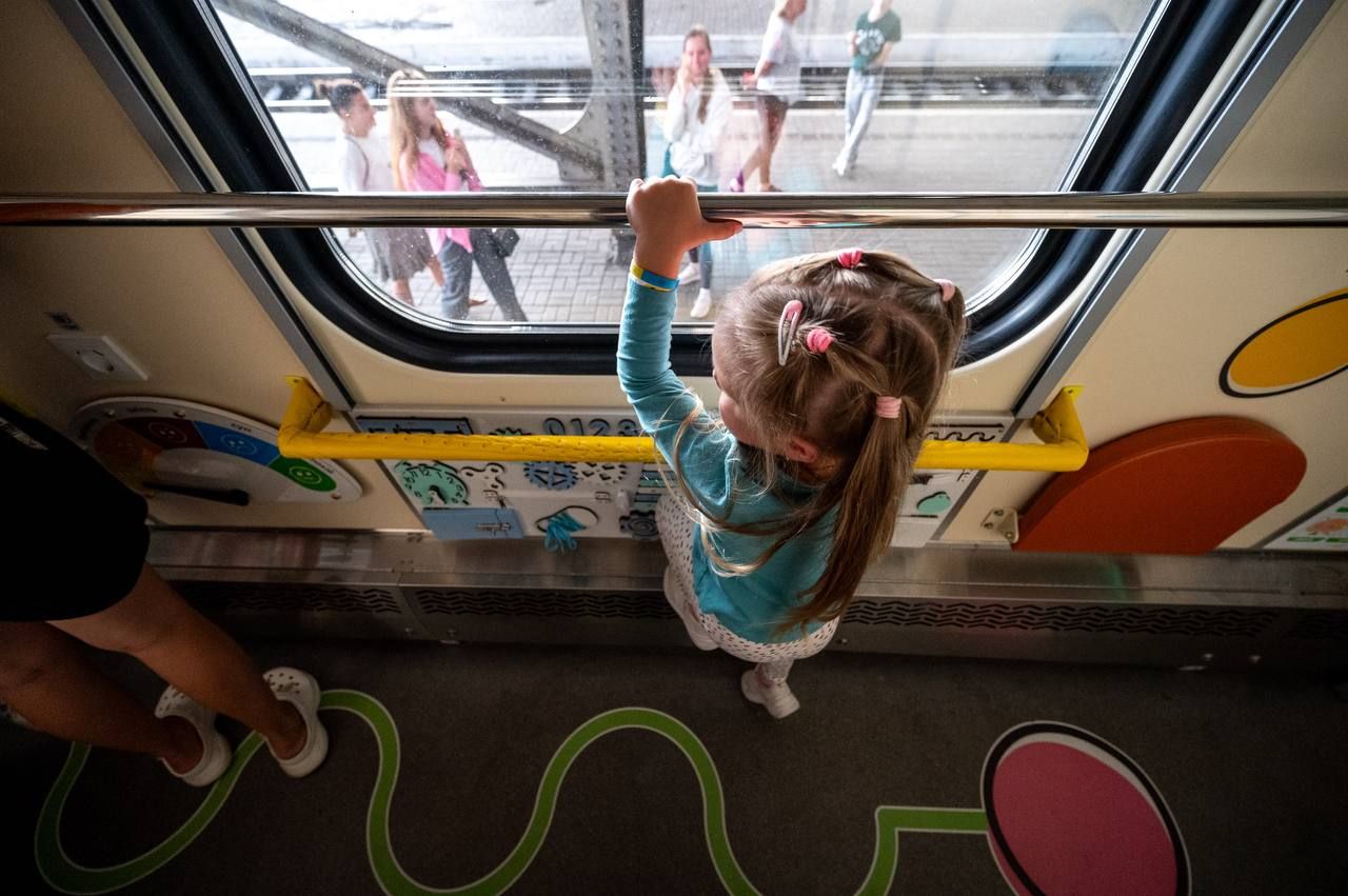 Кожне купе облаштували навчально-розважальними матеріалами, настільними іграми, манежами для малечі та збільшеними обмежувачами верхньої полички із протиударною накладкою. А в коридорах розмістили інтерактивні плакати, бізі-борди з рухомими елементами та дитячі поручні з мʼякою оббивкою для безпечного пересування,
